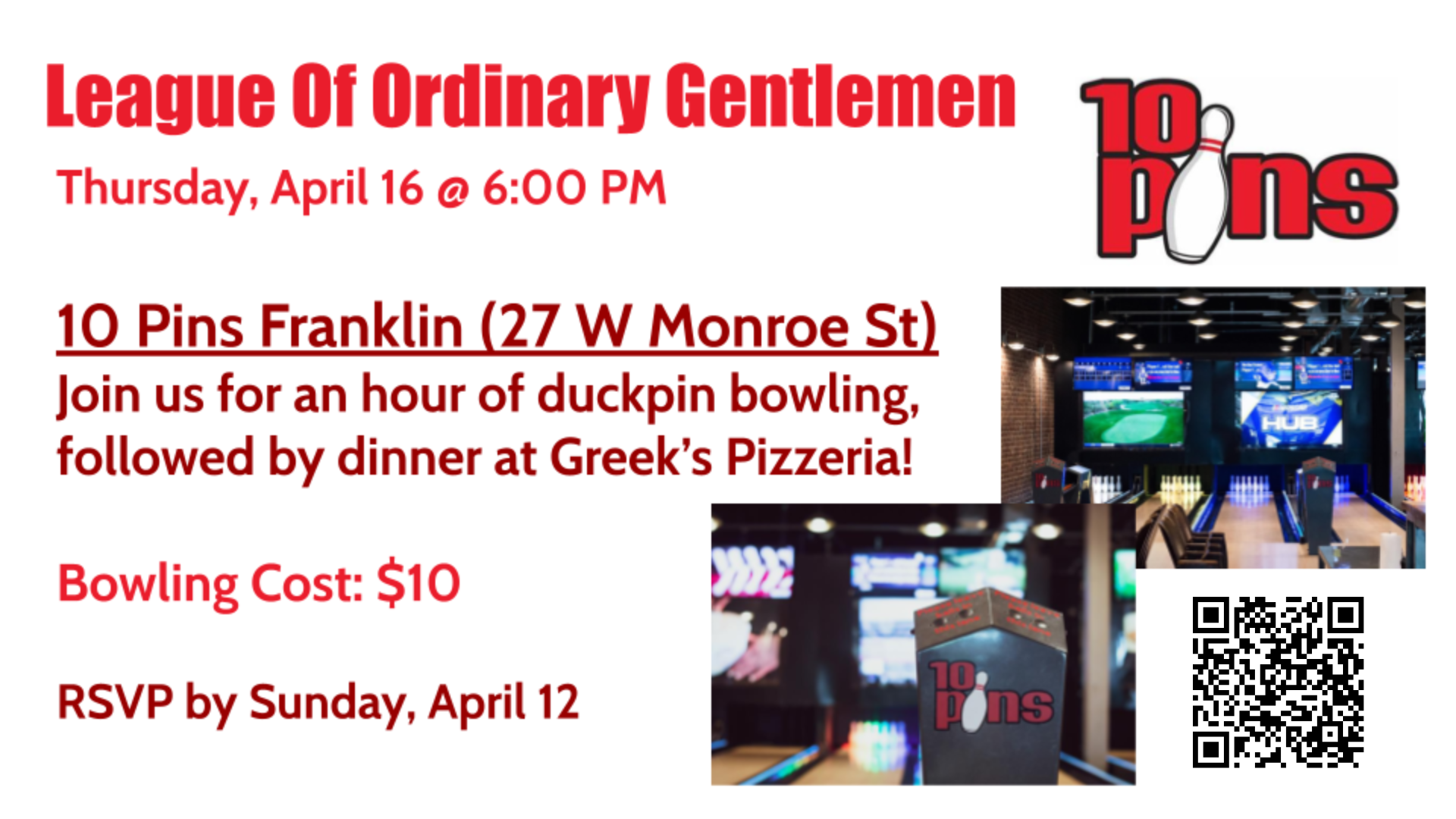 All adult males are invited to join us on Thursday, April 16, at 6 pm for an hour of duckpin bowling at 10 Pins Franklin (27 W Monroe St), followed by dinner at Greek’s Pizzeria. Bowling cost: $10. RSVP by Sunday, April 12, using this link or the QR code in the image above.
