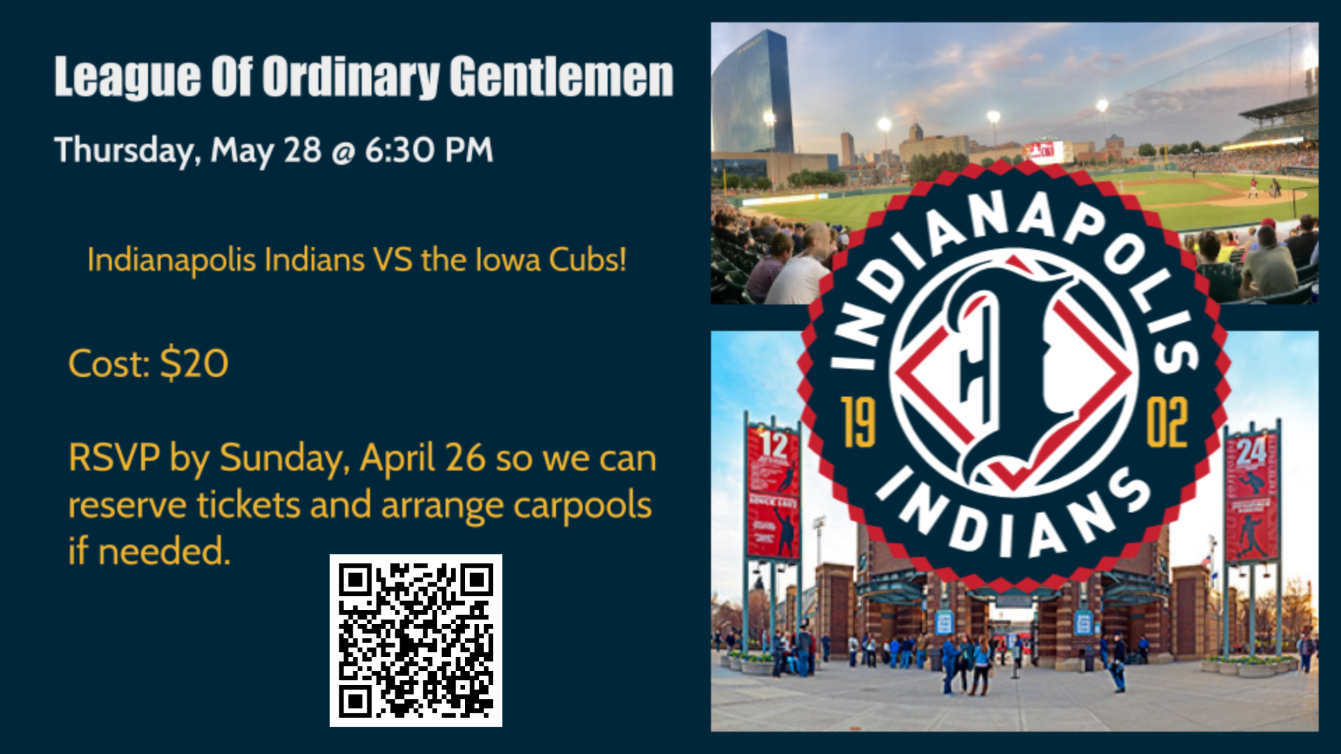 All adult males are invited to join us on Thursday, May 28, at 6:30 pm for the Indianapolis Indians game (hosting the Iowa Cubs). Cost: $20. RSVP by Sunday, April 26, using this link or the QR code in the image above so we can reserve tickets as a group and possibly arrange carpools.